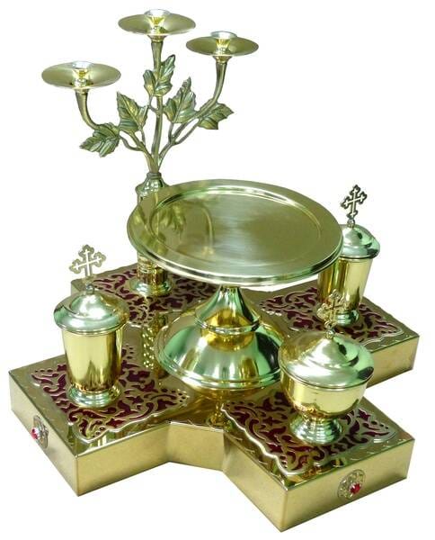 Пропонуємо всенічні блюда, які стануть справжньою окрасою урочистого Богослужіння. Набір складається з підноса з трьома ємностями з кришками, підставки та свічника на три свічки.